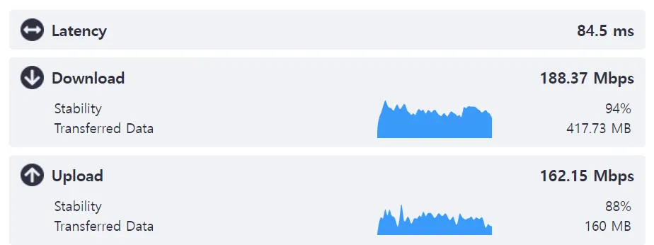 ③ 진행이 완료되면 업로드와 다운로드 속도가 표시 됩니다.