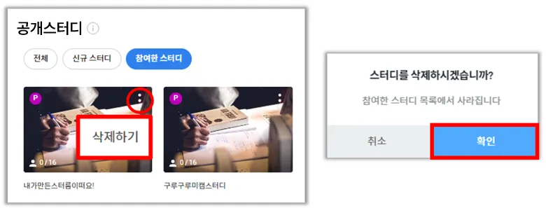 직접 공개 스터디 - 참여한 스터디에서 점 세 개를 눌러 삭제를 해주셔도 됩니다.
