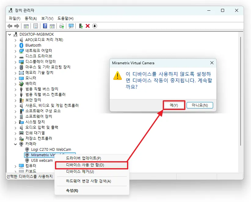 카메라 > Mirametrix Virtual Camera > 마우스 오른쪽 버튼 클릭 > 디바이스 사용 안 함