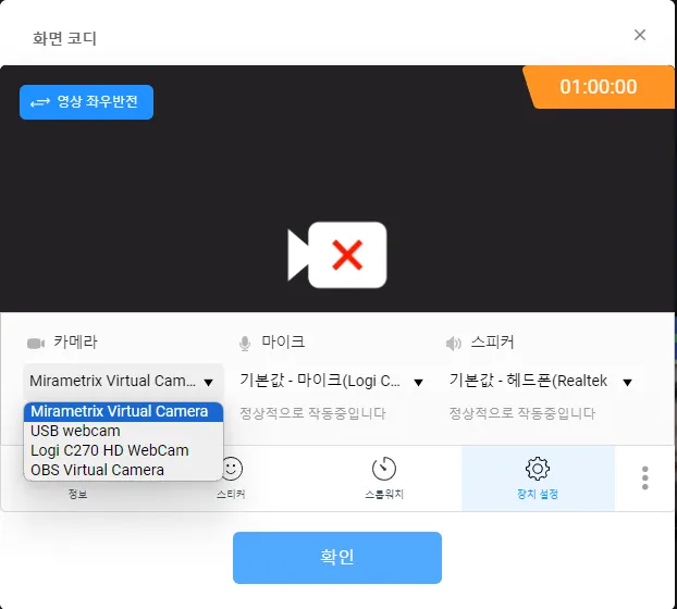 해당 화면은 LG 노트북에서 기본적으로 설정되어 있는 가상 카메라 Mirametrix Virtual Camera가 구루미 카메라로 설정되어 있을 때 보이는 화면입니다.