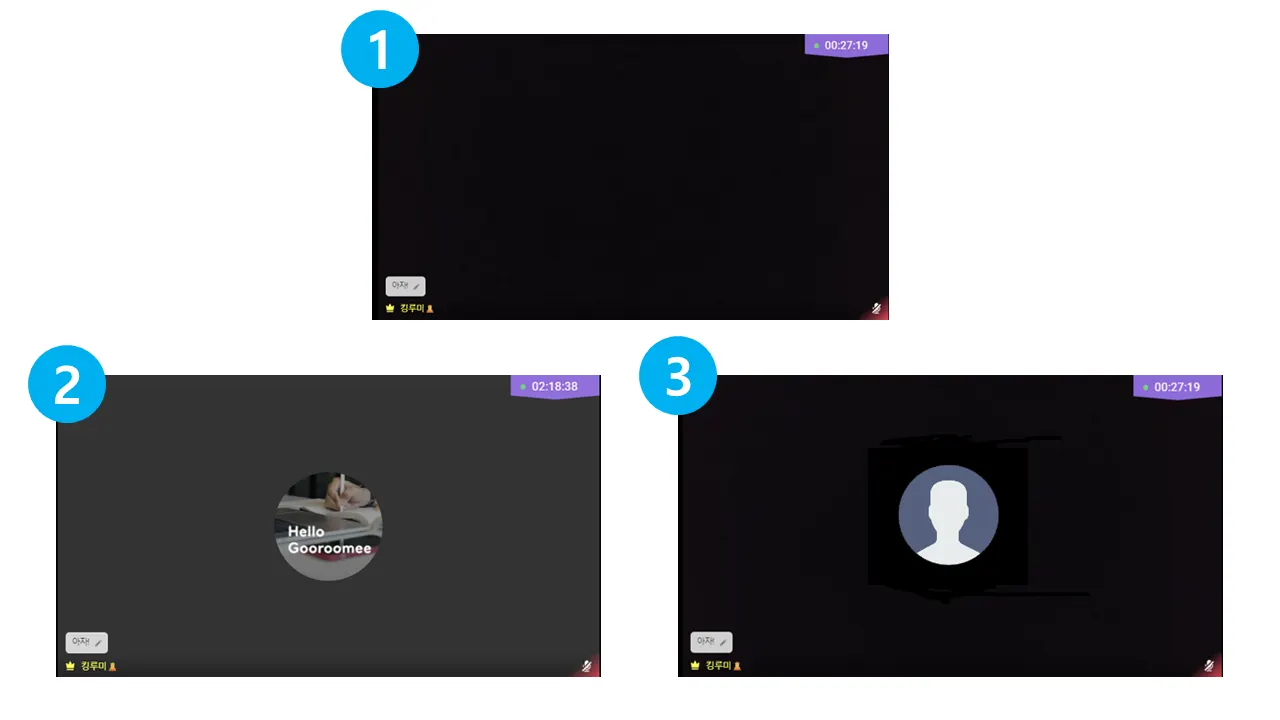 카메라를 켠 상태이지만 특정 사람과 서로 화면이 기본 프로필 화면에 검은 배경으로 보입니다.