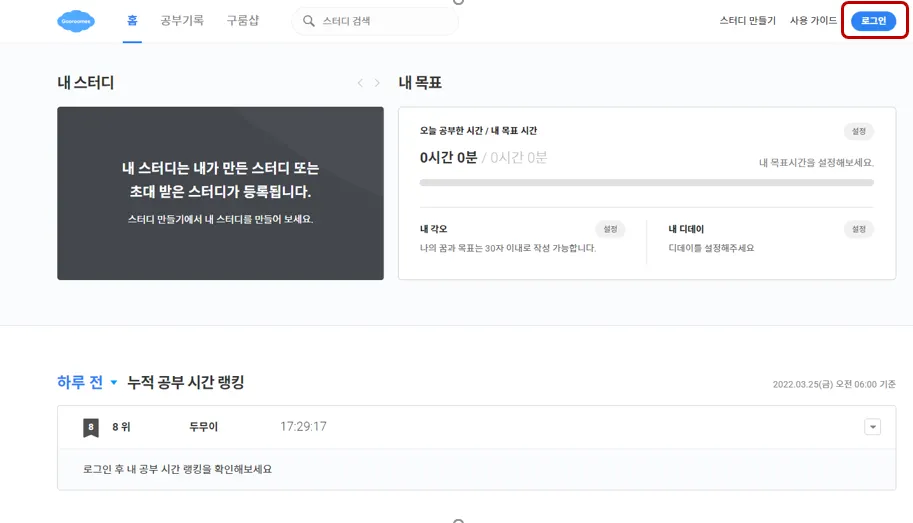 구루미 캠스터디 메인화면이 나오면 우측 상단 로그인 버튼을 눌러 로그인 페이지를 열어주세요.