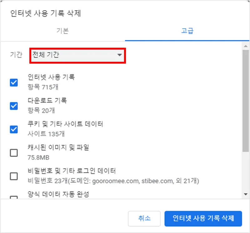 *인터넷 사용기록 및 *쿠키 기타 사이트 데이터 클릭