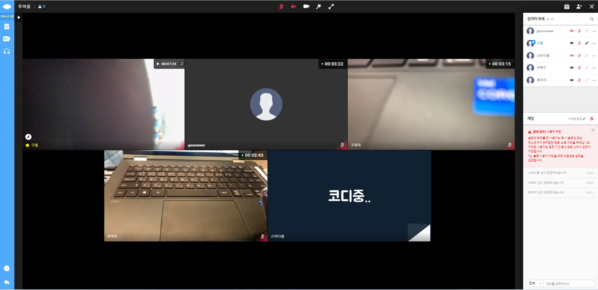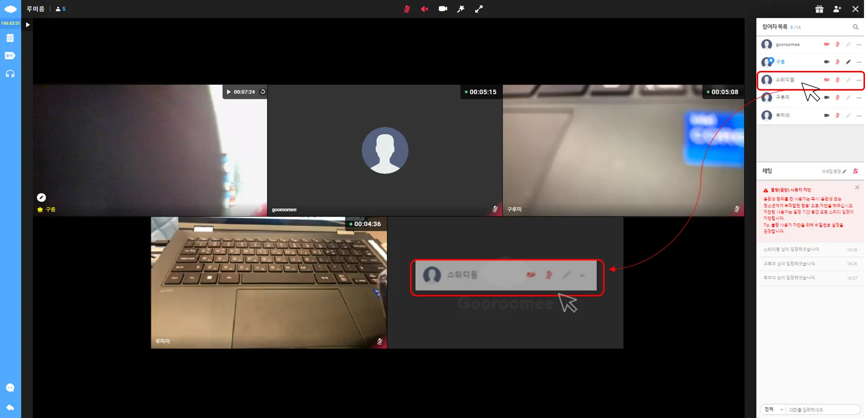 ex) 1. 만약 입장한 인원이 5명인데, 고정 레이아웃을 4인으로 설정하실 경우, 아래 사진처럼 한 명은 레이아웃에 포함되지 않습니다. 이 상태에서는 레이아웃에 포함되지 않는 인원은 출석체크 및 스톱워치 기능 사용이 불가하니 꼭 레이아웃에 포함시키는 것이 필요합니다.