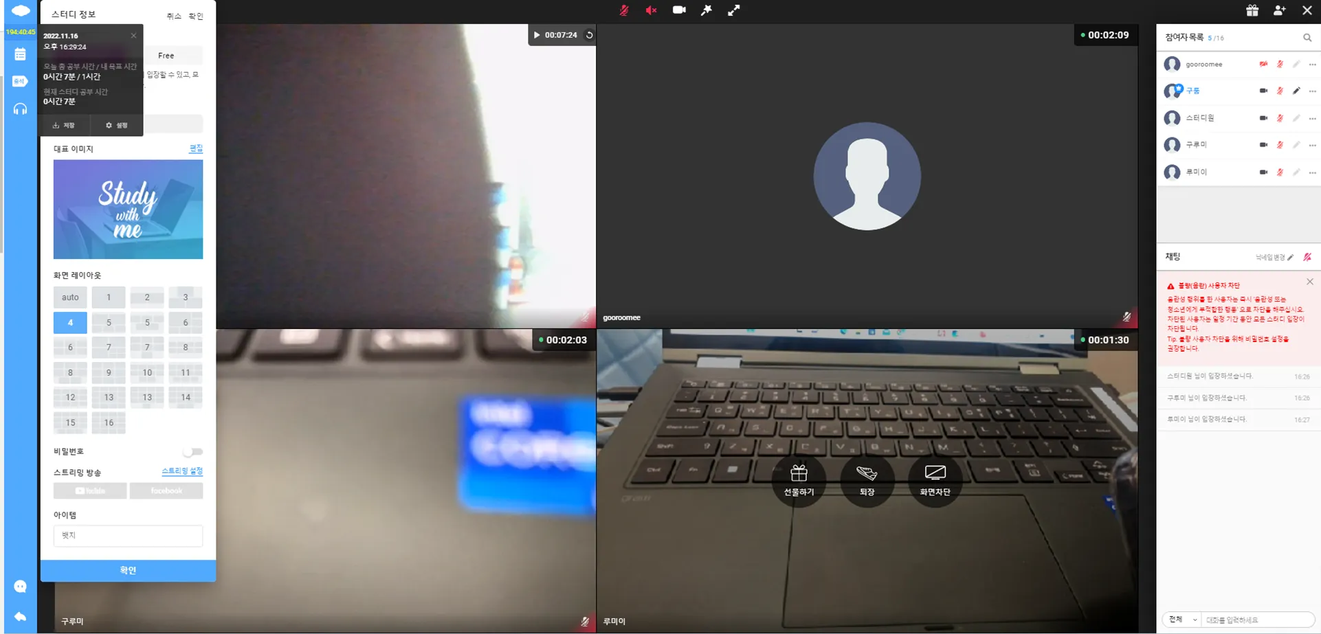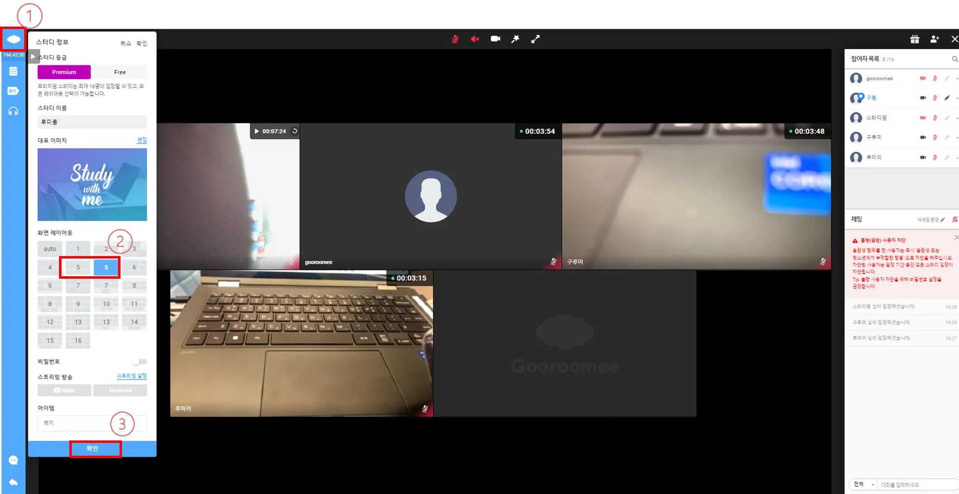 2. 레이아웃 변경을 하기 위해서는 스터디룸 내 왼쪽 상단 구룸 아이콘(방 설정) 클릭 후 - 화면 레이아웃 변경 - 확인 버튼을 눌러주시면 됩니다.