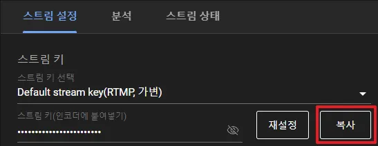 유튜브 스튜디오로 접속하셨다면 스트림 설정 아래 스트림 키 오른쪽에 있는 복사 버튼을 눌러 스트림 키를 복사합니다.