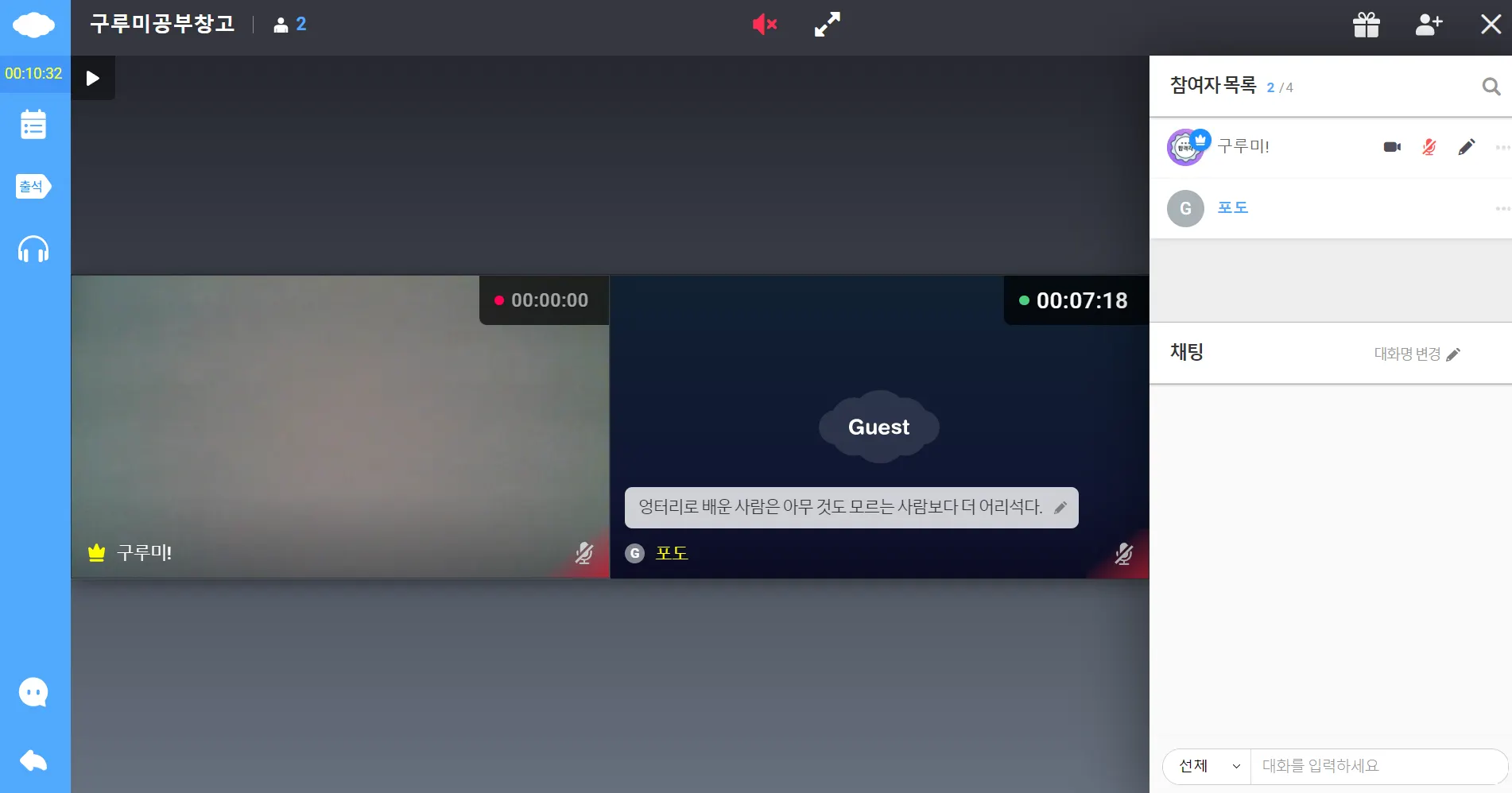게스트로 참여하게 되면 카메라와 마이크는 꺼져 있는 상태로 화면에 Guest라고 표시됩니다.