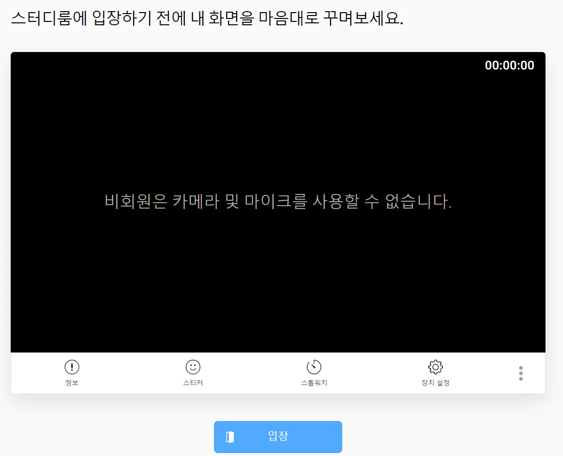 카메라 및 마이크, 스티커 및 스톱워치는 로그인과 회원 가입을 해야 사용할 수 있는 기능이예요. 비회원의 경우