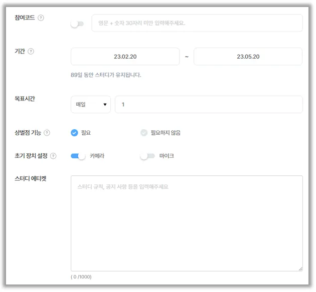 Tip. 공개 스터디 방에 참여코드를 제한해 두었다면 참여코드를 물어볼 수 있는 카톡 ID / 밴드 정보 등을 입력하여 공유해 보세요!