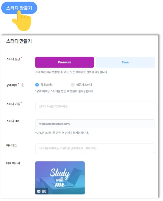 프리미엄 유저만 입장이 가능한 프리미엄 스터디룸, 모든 유저가 입장이 가능한 프리 스터디룸 중 한 가지를 골라 개설해 주세요.