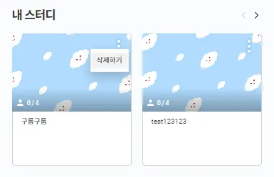 최초 개설자는 내스터디 목록에서 세로 점 세 개 버튼을 누르면 삭제하기 버튼만 뜨게 됩니다.