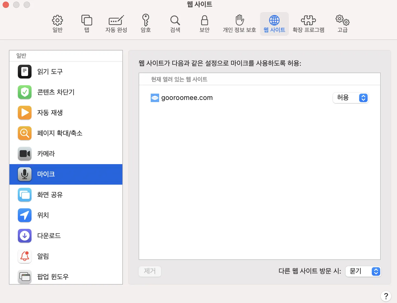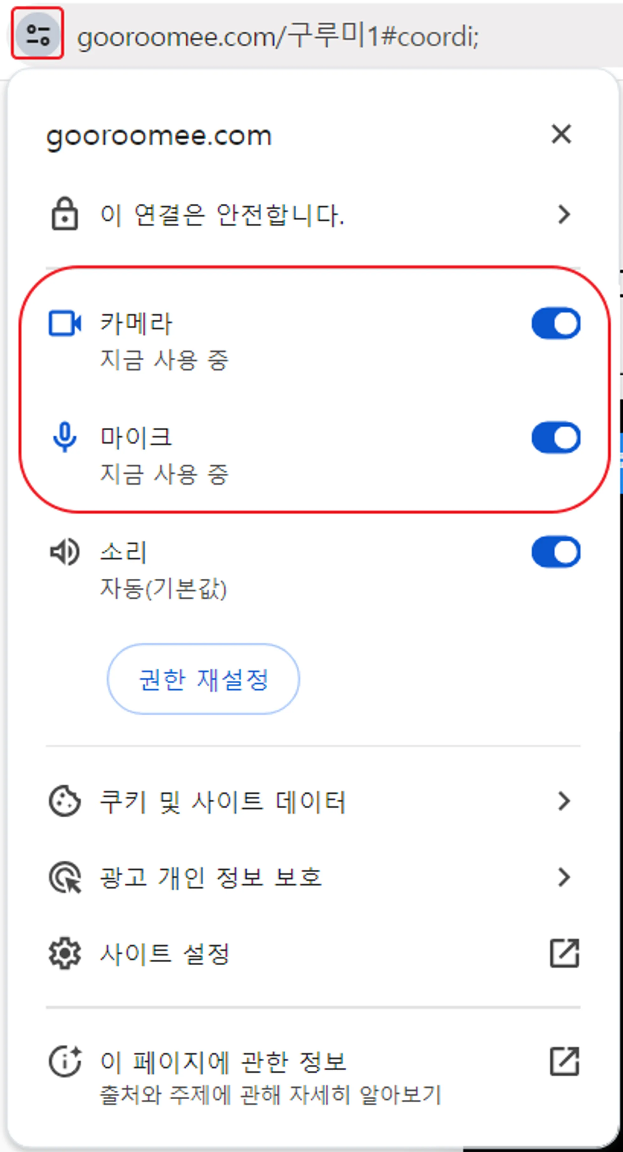 웹사이트 클릭 후 ‘gooroomee.com에서 카메라/마이크를 사용하도록 허용’ 해주시면 됩니다!