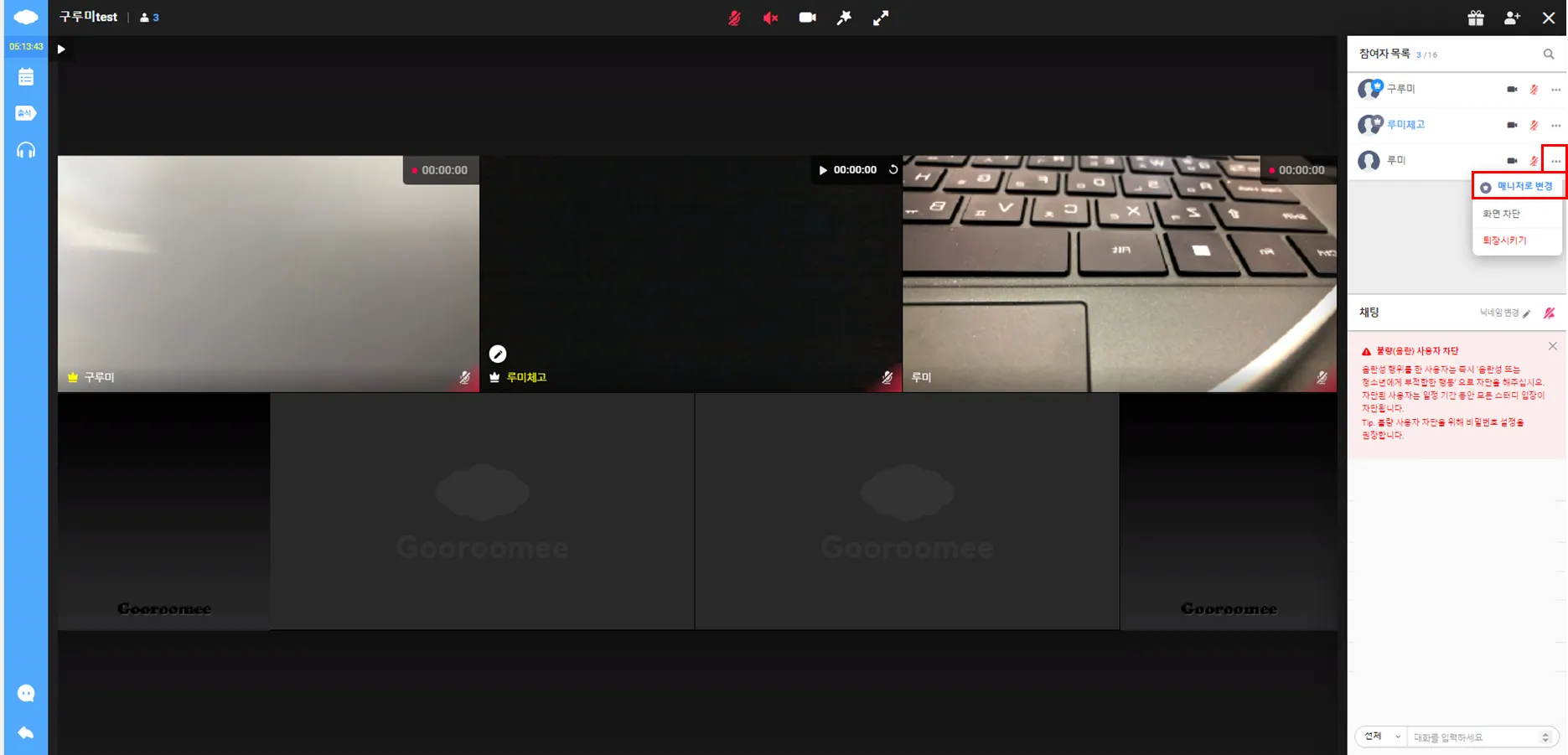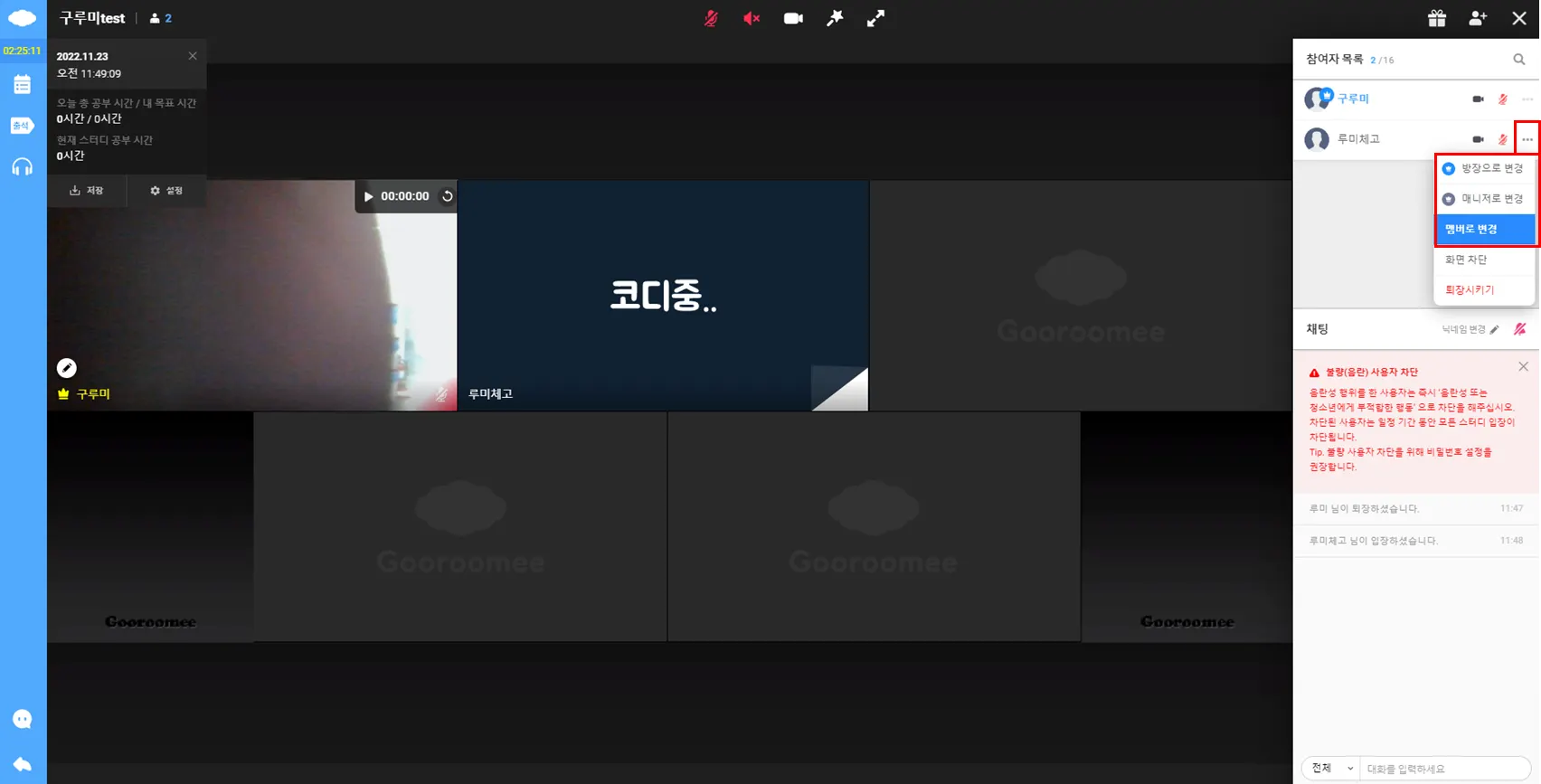 방장 본인은 매니저/ 멤버로 변경이 불가능합니다. ( 방장 권한을 가진 유저가 없어지는 것을 방지하기 위함 )